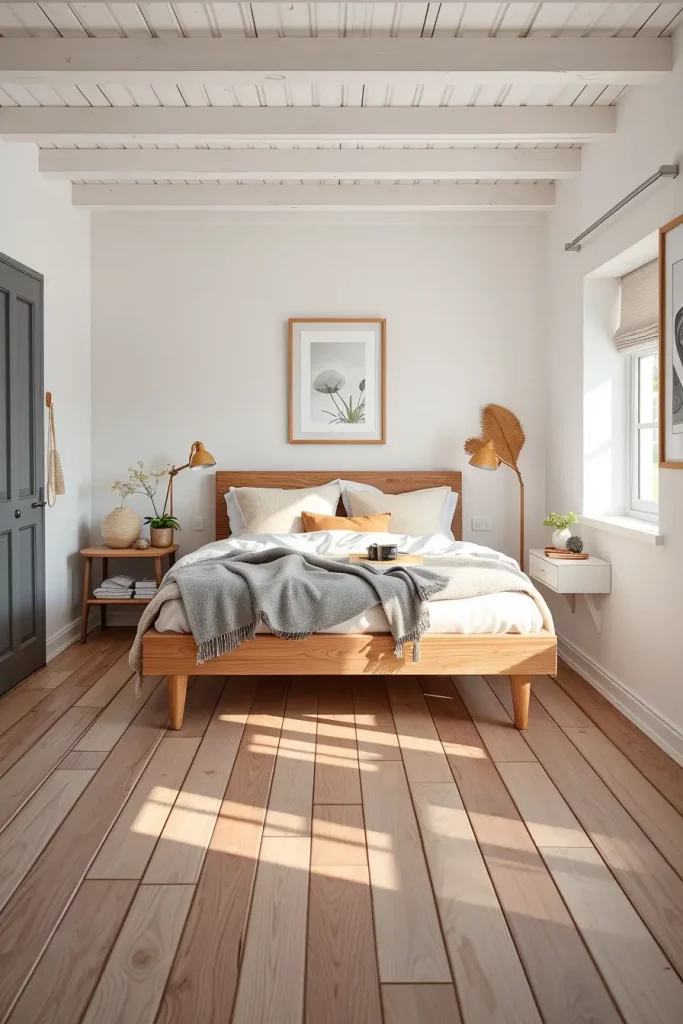 Scandinavian small bedrooms are minimal but comfortable with furniture. I would suggest low wooden bed frames, plain nightstands, and open shelves in natural finishes. Wool throws, cotton bedding, and linen curtains are textiles that make the room cozy and textured without crowding the room.
