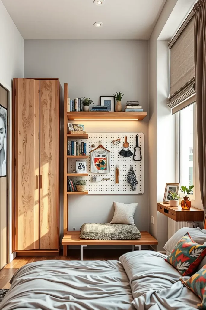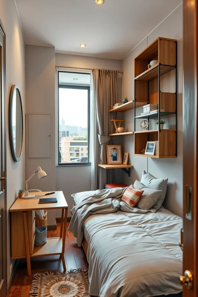 I suggest platform beds that have under-bed drawers, desks mounted on the wall, and modular storage that can be easily adjusted. Framed photography or simple geometric art can be used to add character without cluttered. Practical features such as a charging station or small shelves are added to the appearance.