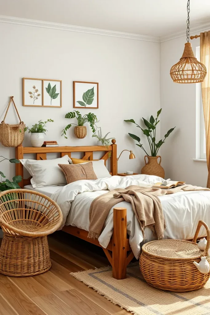 Furniture usually encompasses wooden bed frames, wicker baskets and rattan chairs. The nature connection is reinforced with the help of decor elements such as linen bedding, stone accessories, and leafy prints on the walls. I also suggest placing actual plants in small pots because these enhance the appearance and the quality of the air.