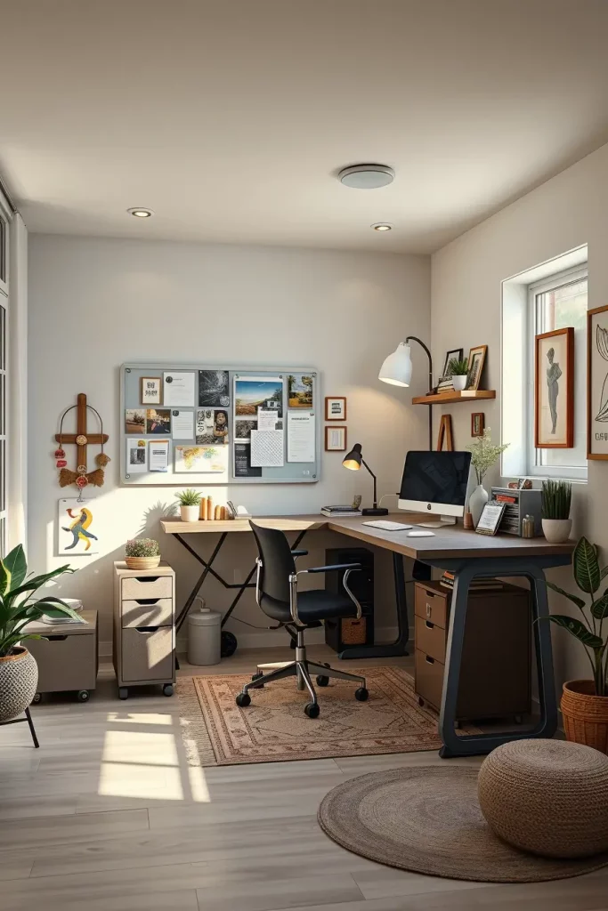 I incorporate spacious desktops, light adjustment, boards, and movable storage facilities. All these factors enable the creatives to alternate between the digital and physical activities with ease when standing or sitting.