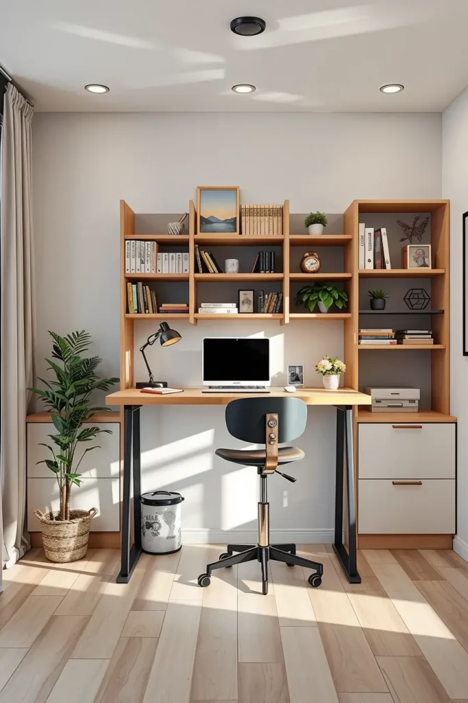 The use of drawers, cable compartments, shelving, and under-desk storage allows keeping the surface clean. I would recommend the use of those storage solutions that do not stand out in the visuals to ensure that the desk does not look corporate, but rather residential.
