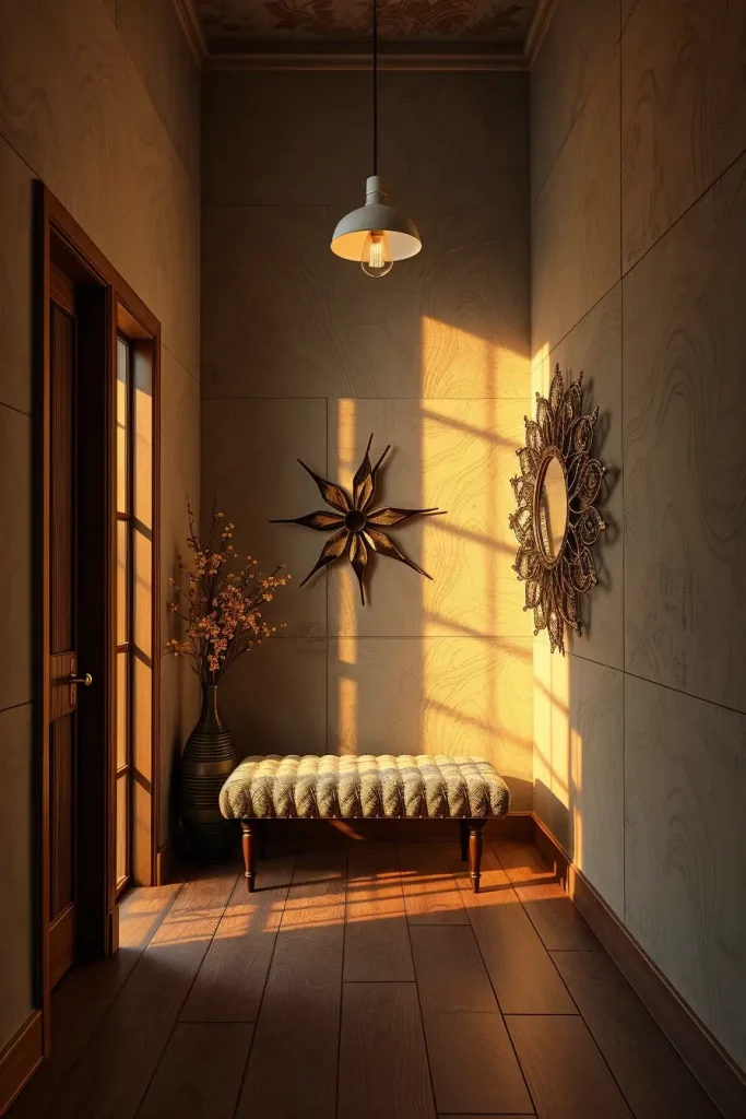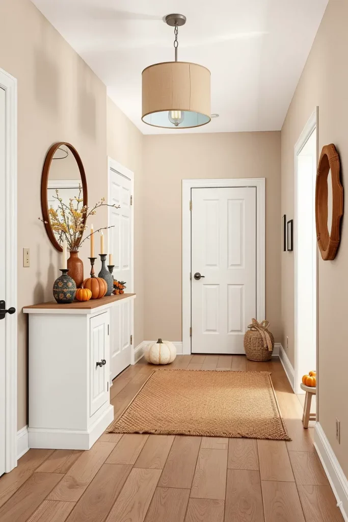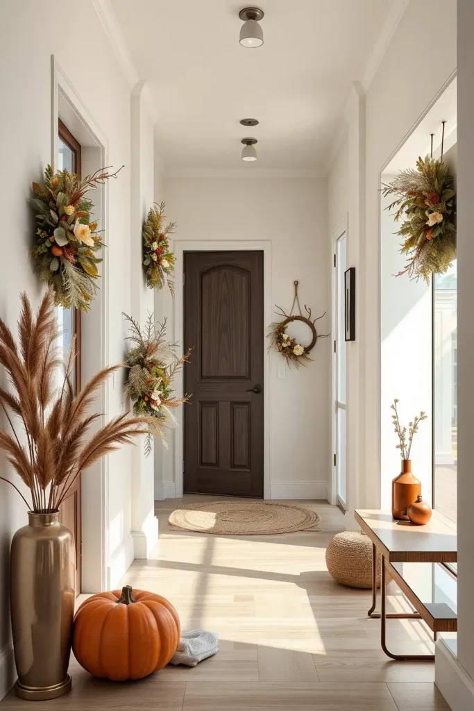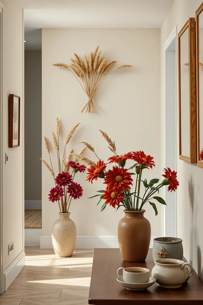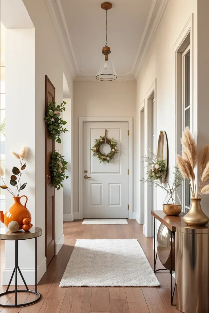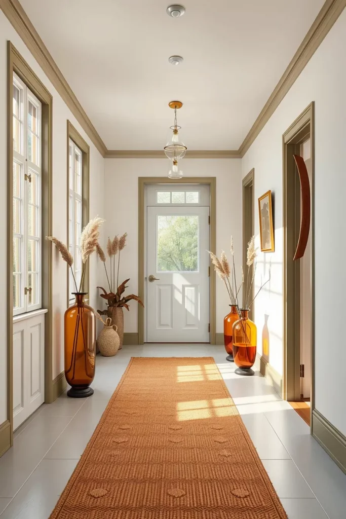I will counteract the brightness with texture with jute or sisal runners and paint the hallway with matte finishes that absorb and reflect the sunlight in different ways during different times of the day. The seasonal decoration includes decorative amber glass vases, handcrafted ceramic bowls with pinecones, and woven panels on the wall that do not overload the space. Vertical interest and softness are achieved by placing tall arrangements of dried grass in corners.