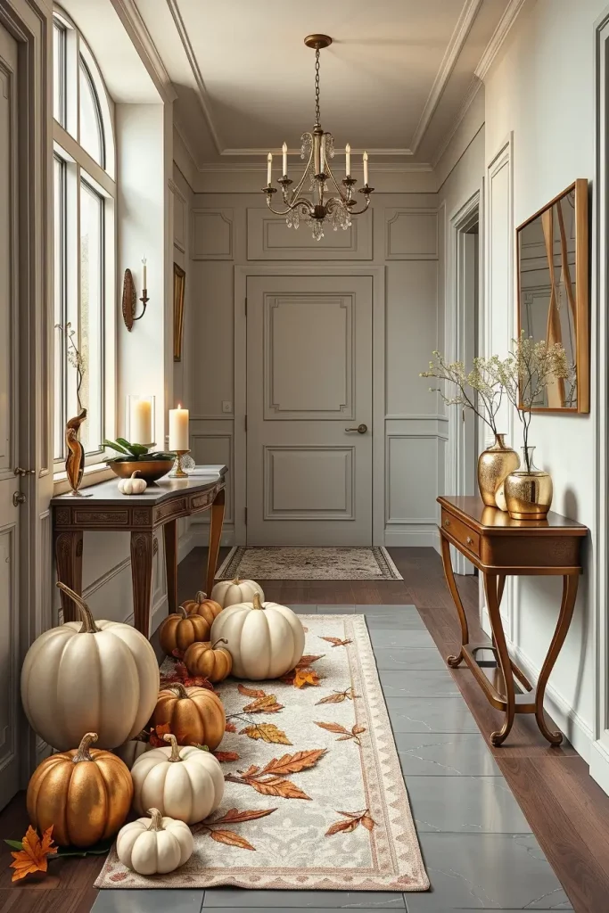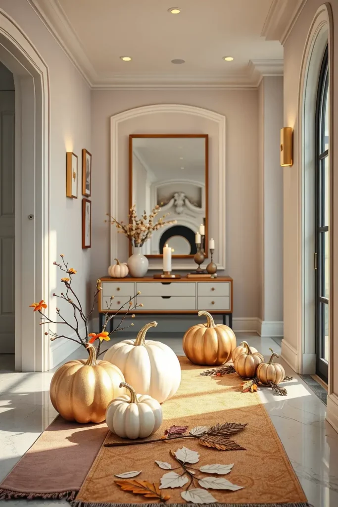 Pumpkins are a seasonal treat, but in 2025, it is all about high-end interpretations. Rather than bright orange gourds, use neutral, matte, or metallic pumpkins, ceramic, wood, glass, or velvet. These sculptural and luxurious items enhance your hallway decor.