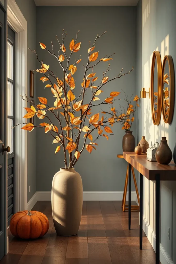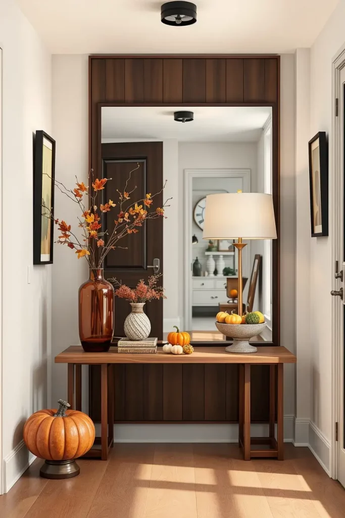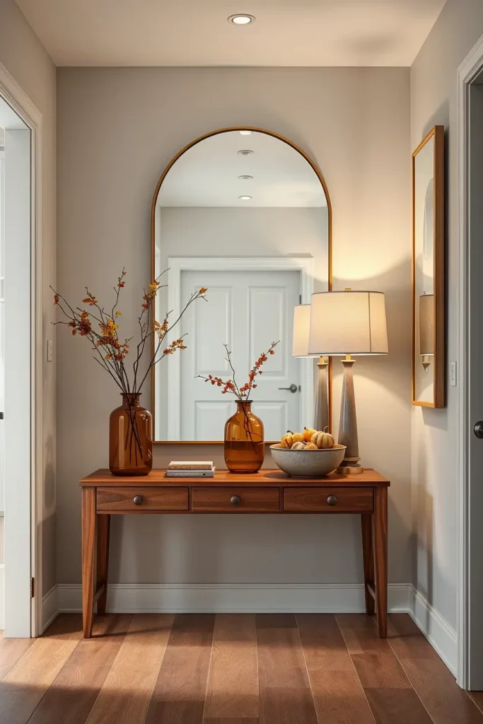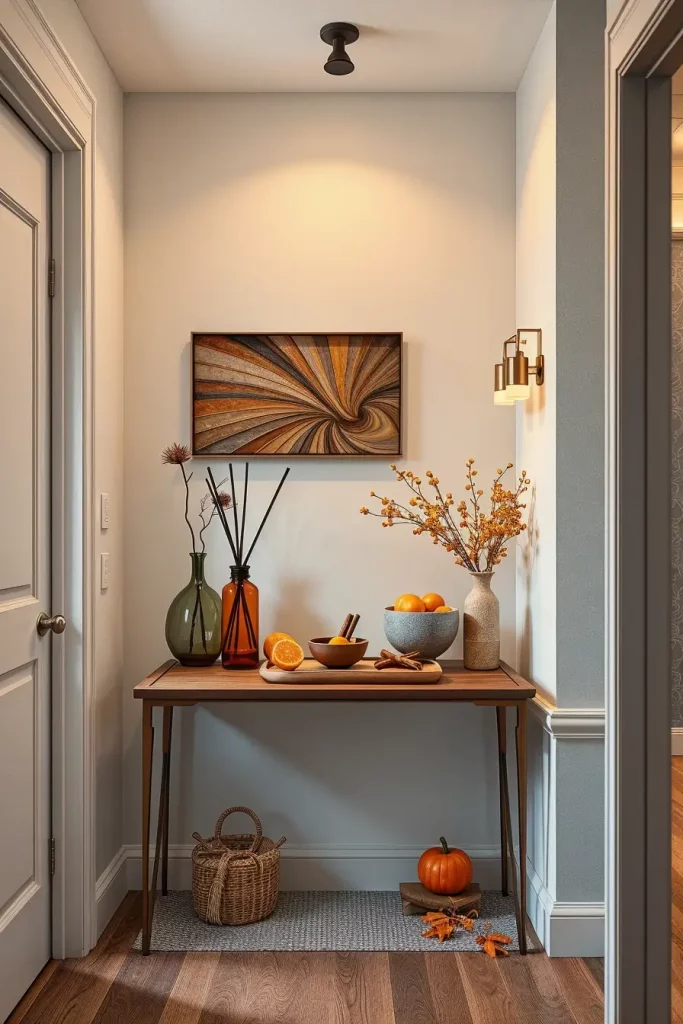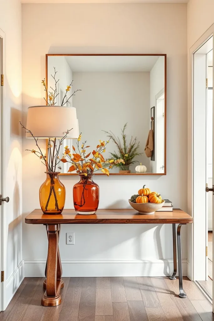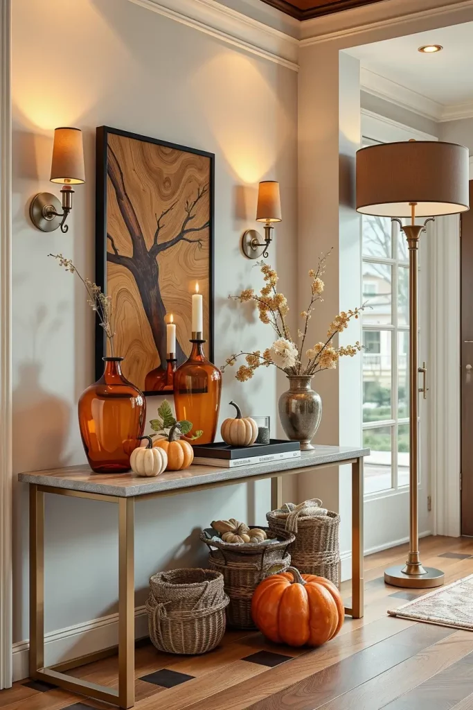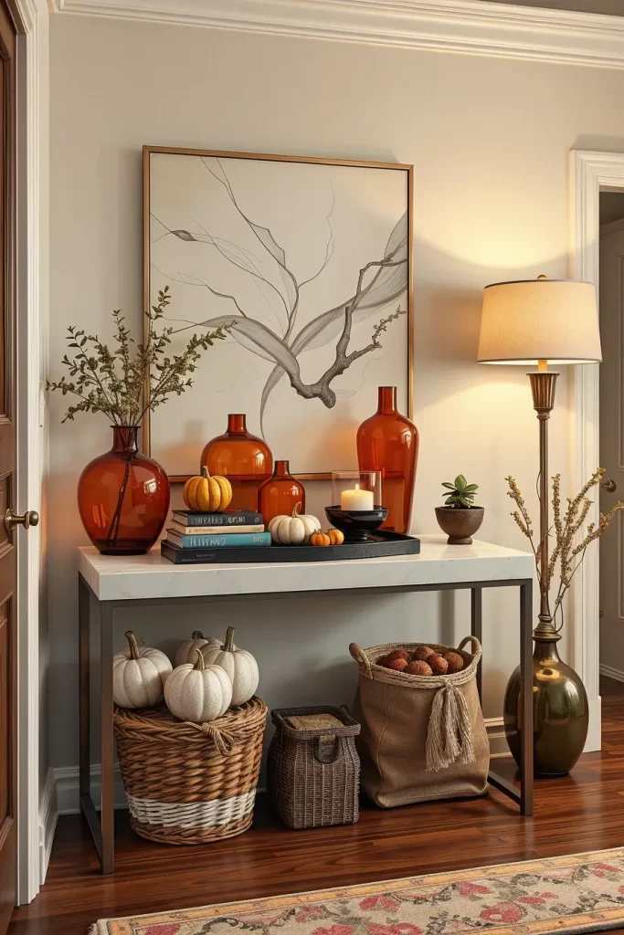 Your console table is not only a place to store keys, but it is a canvas to display seasonal style. In 2025, choose simplified wooden or metal-framed tables and then add in decor that reminds of fall: amber glass vases, ceramic pumpkins, and textured linens. This makes a harmonious blend of utilitarian and ornamental.