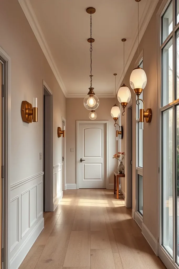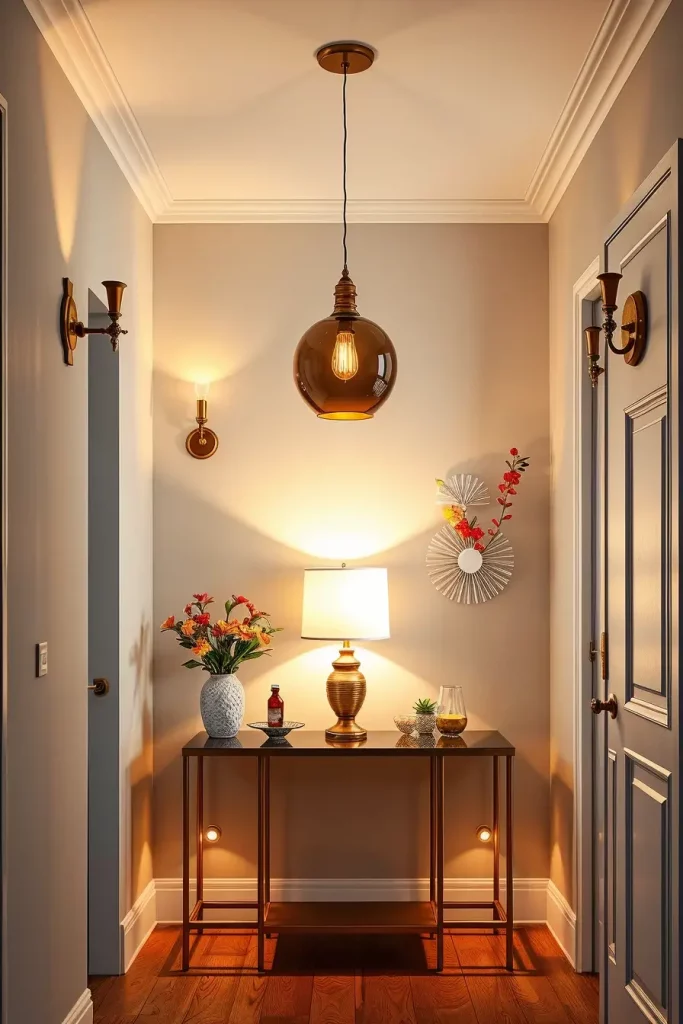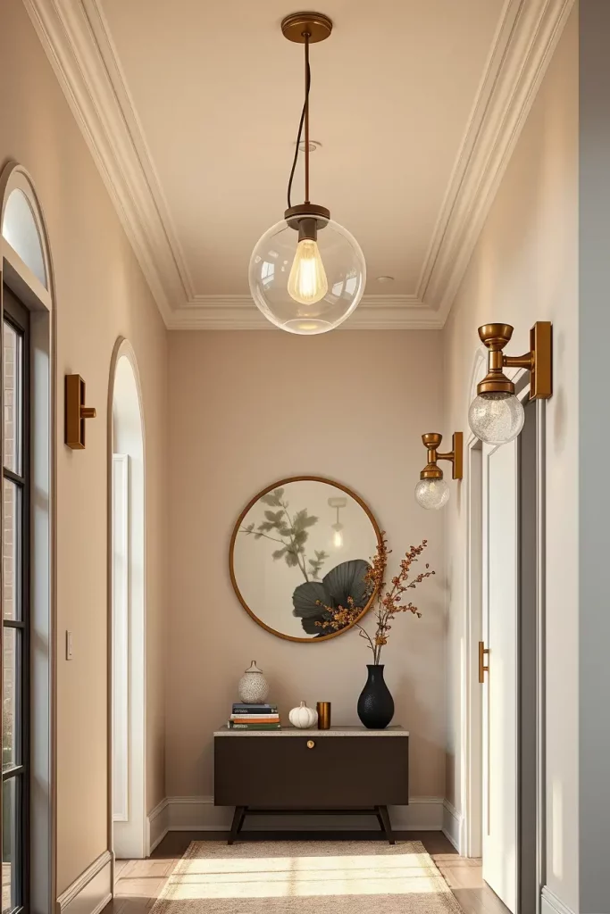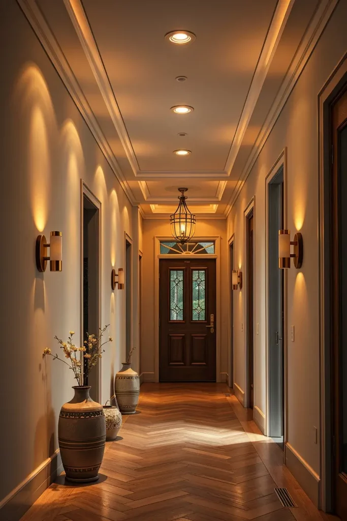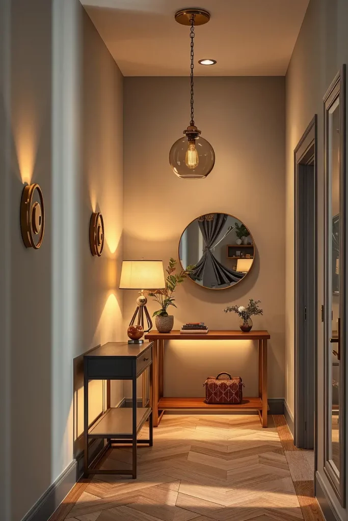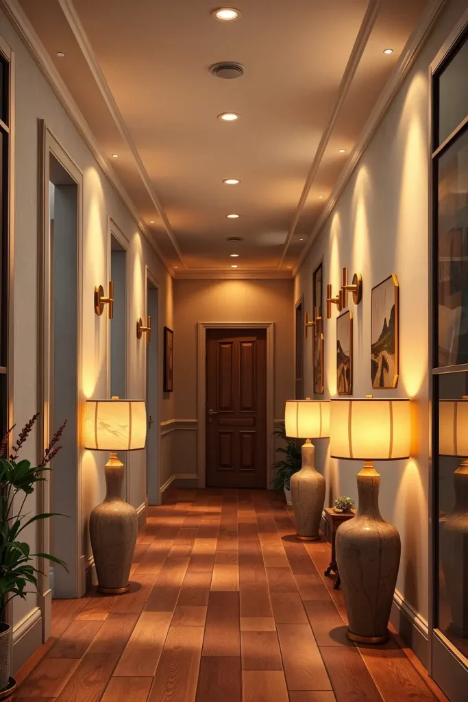 I suggest that you should include a combination of lighting to make your hallway have depth. As an example, combine a statement light that is mounted on the ceiling with warm LED under-shelf strip lighting or small table lamps on a console. Provided you have the room, place a narrow-based floor lamp, with a rattan or linen shade. The trick is a gentle, golden light which accentuates textures and colors but does not seem harsh.