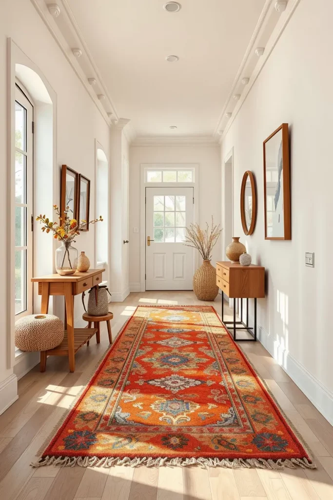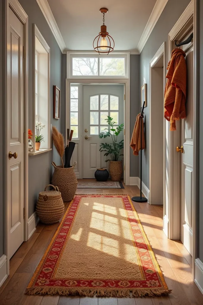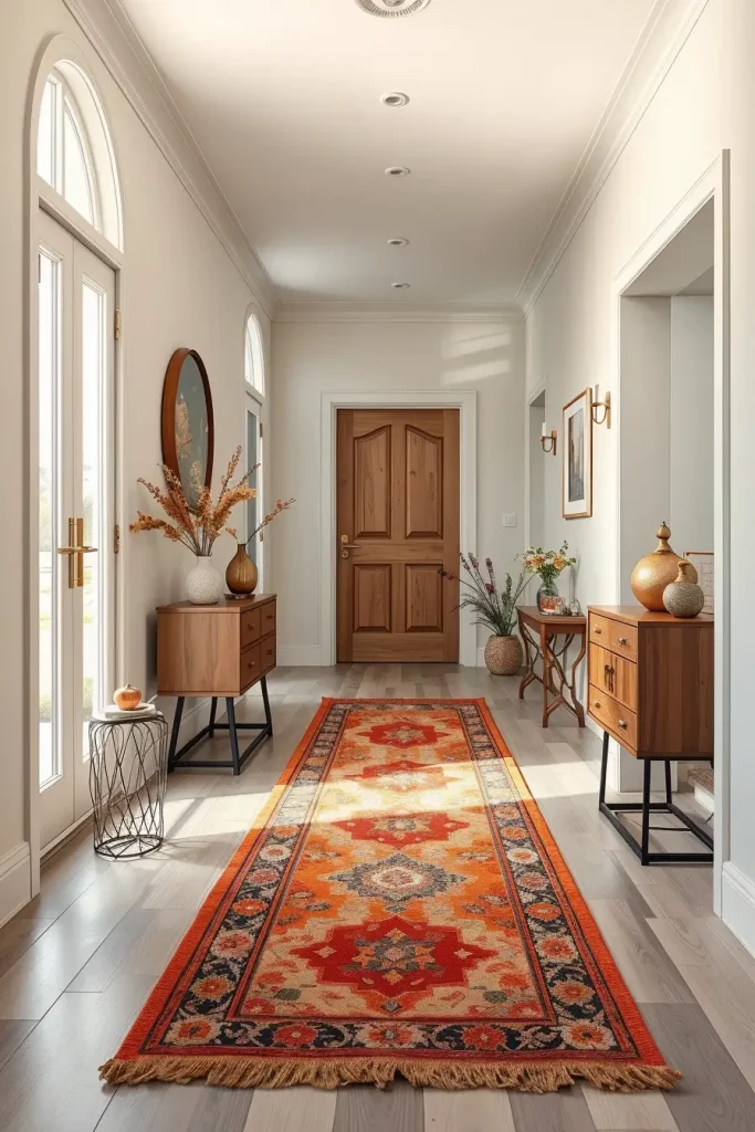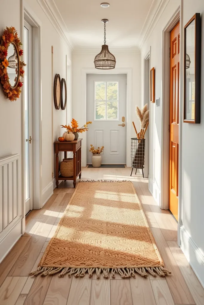 A beautiful fall hallway runner with subtle fall patterns is one of the simplest and most effective upgrades of a fall hallway. I like earthy patterns, muted flowers, faded Persian patterns or abstract rust-coloured patterns. These stabilize the room and also give warmth and sound absorption.