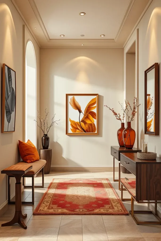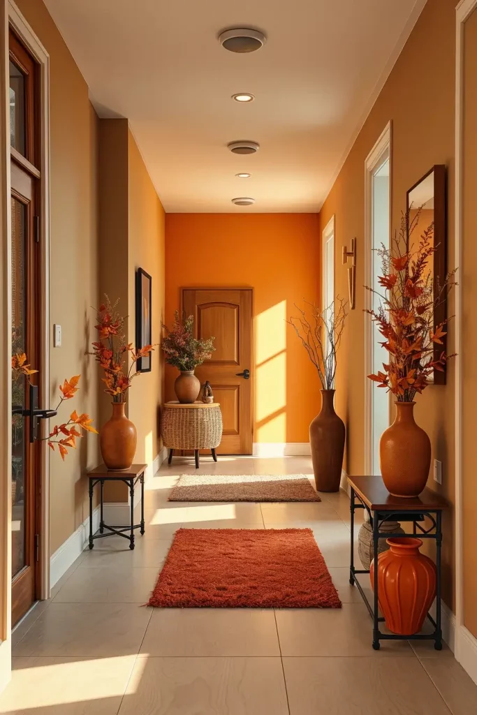 The first thing I will always do is the color palette since it will determine the rest of your fall hallway. In 2025, we are going to go into burnt orange, muted mustard, rust, and cinnamon, but we are balancing them with more neutral colors such as warm taupe, beige, and muted olive. The aim is to make the person feel welcome the moment they enter your door. These tones provide a visual warmth without overwhelming a small or narrow space of the hallway.