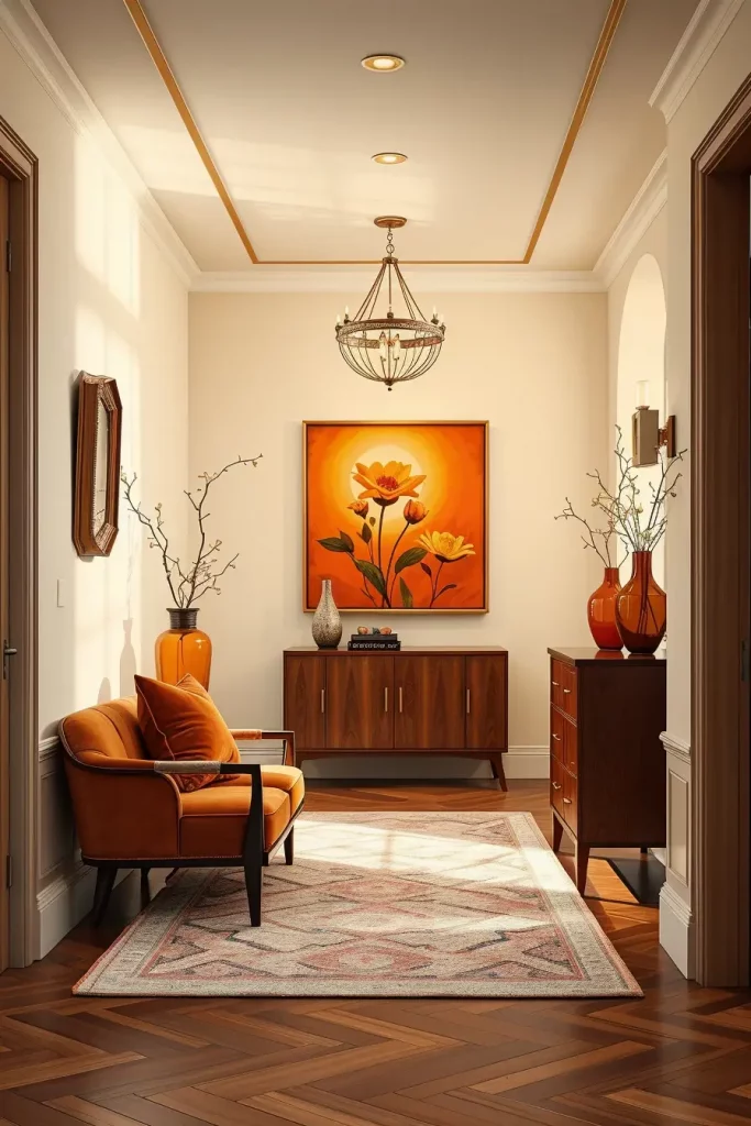 Bright burnt orange and ochre are traditional fall colors- but in 2025 it is important to wear them in a sophisticated way. I prefer to use these shades in art, textiles or smaller decorative pieces rather than saturate the room. These colors can be used in a clever way to make a dull hallway look rich and full of energy.