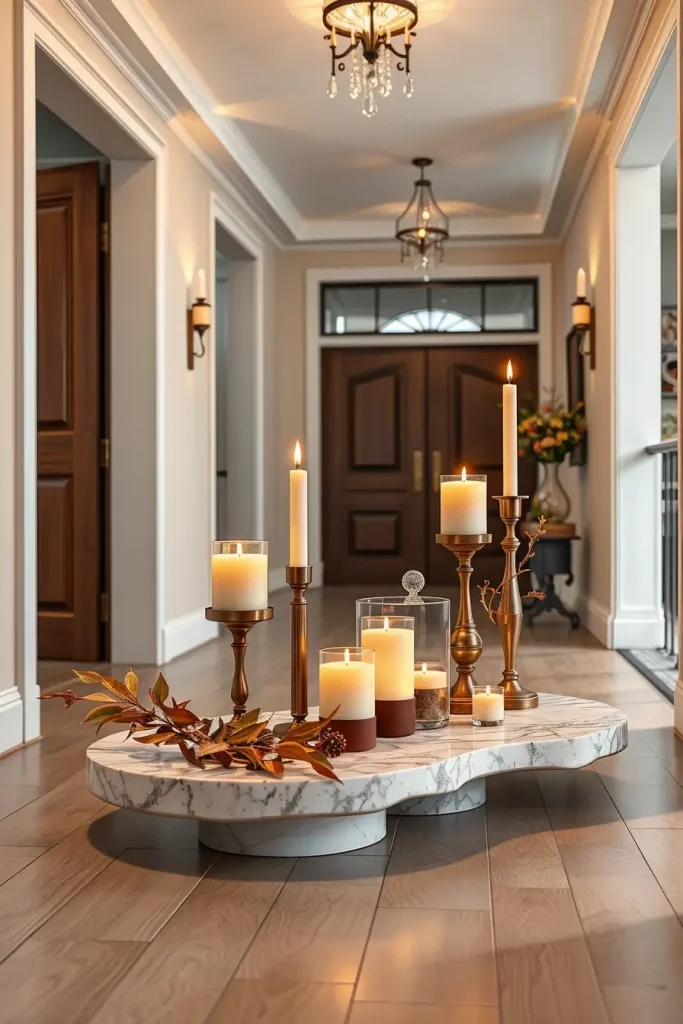 I suggest combining pillar candles of different heights, taper candles in artistic candle holders and tea lights in colored glasses. Aroma-wise, choose sandalwood, patchouli, apple cider or cinnamon mixtures. I place these on stone trays, marble slabs or floating wall shelves to raise the appearance.