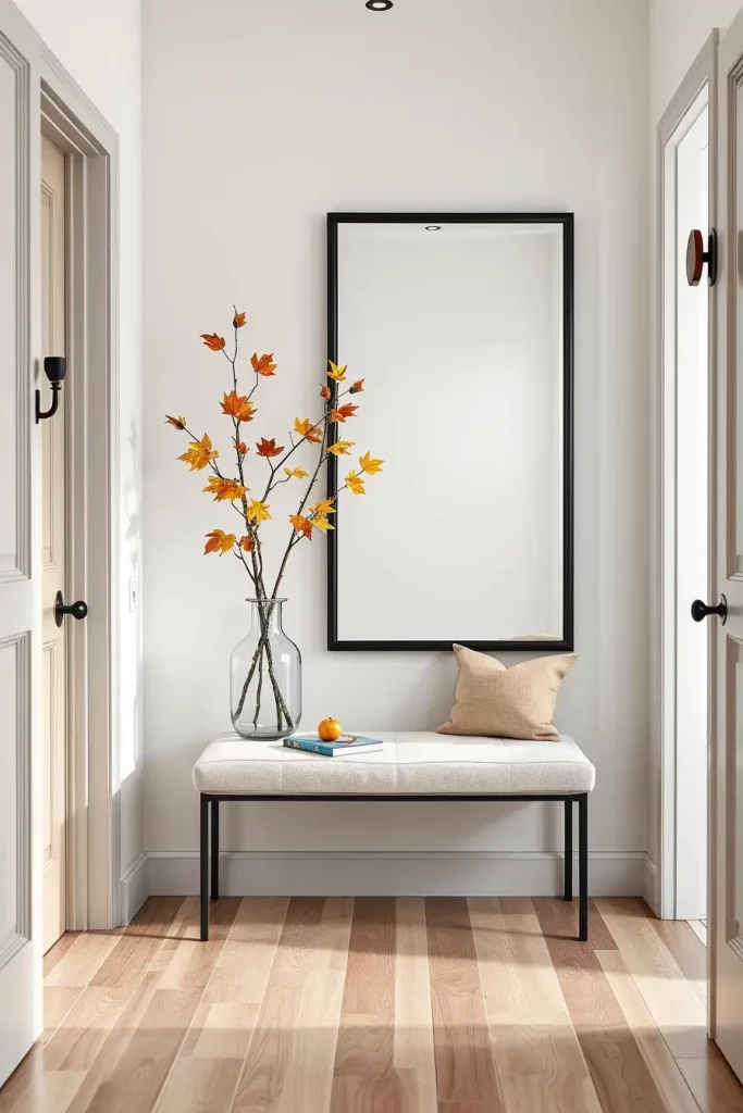The only items I have in my minimalist fall hallway decor are a linen-upholstered bench, a black-framed mirror, and a single vase of preserved maple branches. My keys are in a matte ceramic tray and the only color is the foliage. It is not seasonal in the obvious sense, but deliberate.