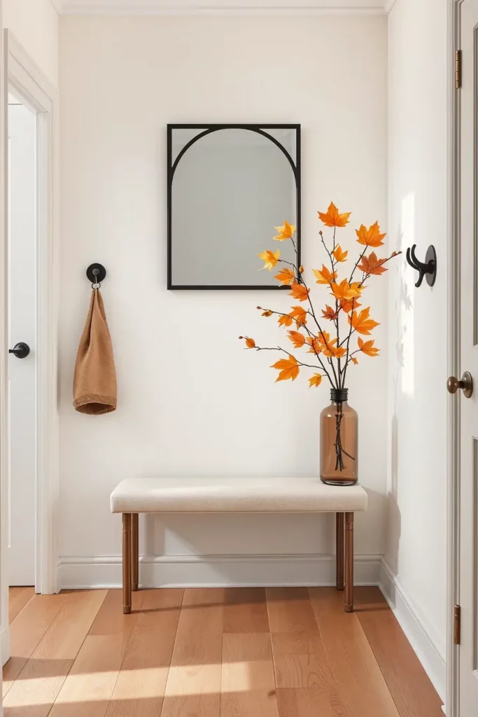 And in case you are more into a cleaner aesthetic, 2025 has no shortage of minimalist ideas to bring fall inside. Rather than filling your hallway with pumpkins and leaves, keep it simple with shapes, monochrome palettes and minimal accessories. Imagine a skinny wooden bench, one abstract print in autumnal colors, and matte black or brushed brass hooks.