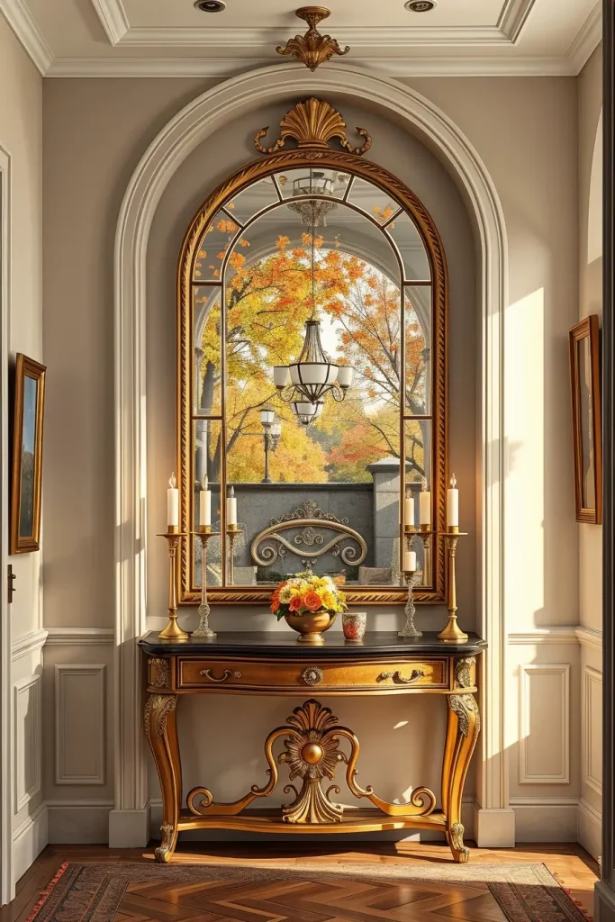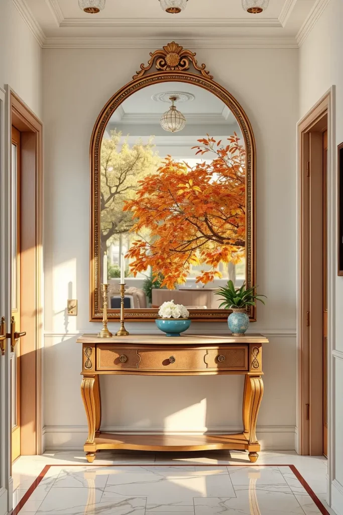 One of my favorite functional decor items in a hallway is mirrors and when done correctly in the fall, they can also be used as reflective art. The trend in 2025 is the revival of the ornate and vintage-style mirrors with gold frames, arched tops, or beveled edges. These designs brighten the light and reflect the golden colors of the season.