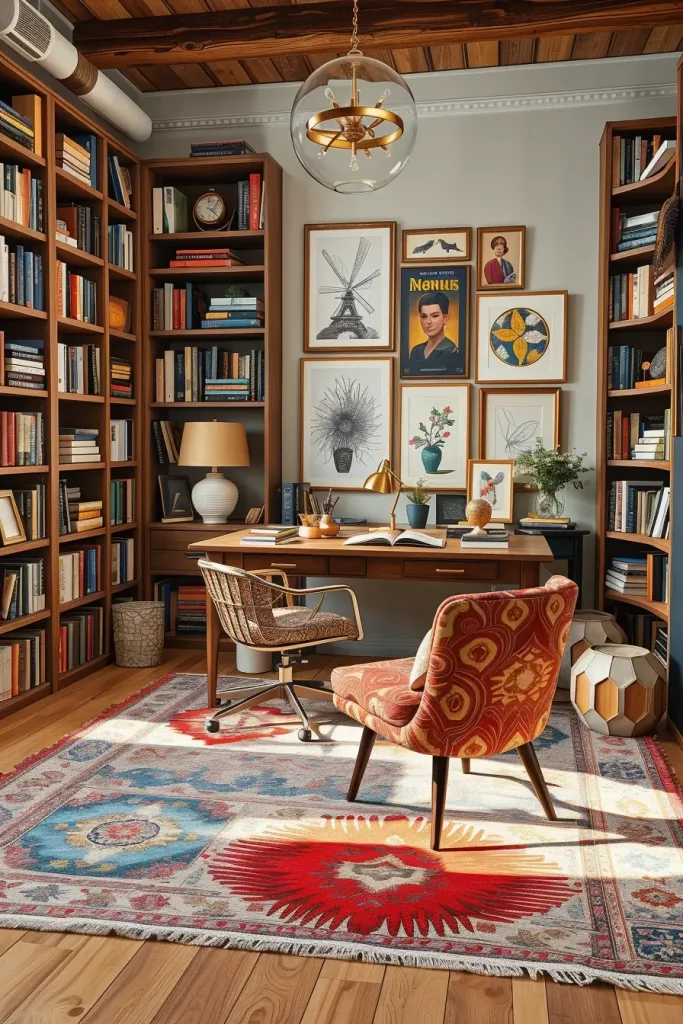 Furniture is a major factor here- bright desks, patterned chairs, and storage items that can also serve as decorative objects. I tend to suggest the combination of antique pieces with modern ergonomic furniture, which helps to create a functional, yet highly personal space.