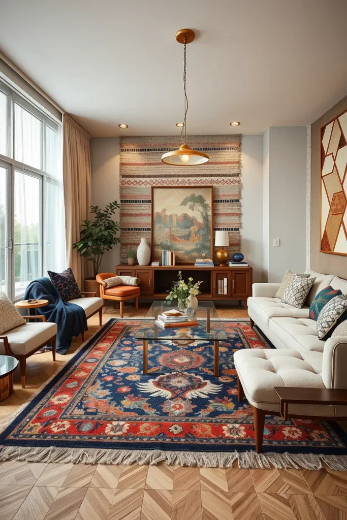 I would recommend experimenting with unusual locations of the rugs-such as hanging an ornamental textile on the wall that would match the floor design. This doubles the effect and adds to the maximalist layering effect.