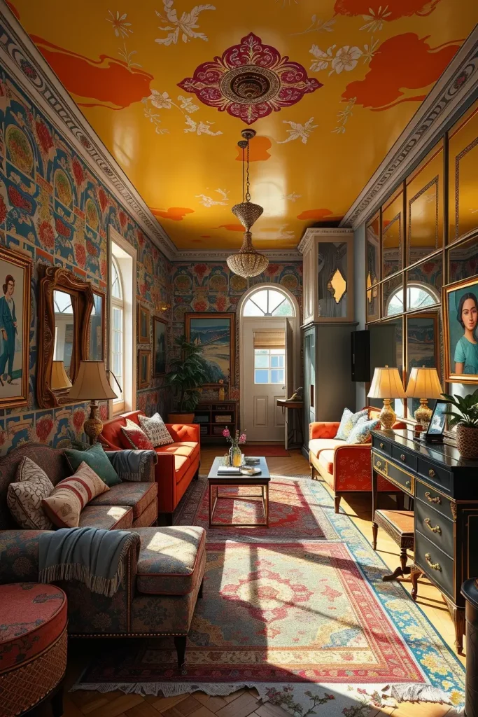 Maximalist living rooms are the core of the interiors. Here is where daring decisions can be the most effective I prefer to fill the space with patterned carpets, coloured sofas, layered lighting, and decorative items. The idea is to make the living room look like a visual treat without making it unusable and unwelcoming.
