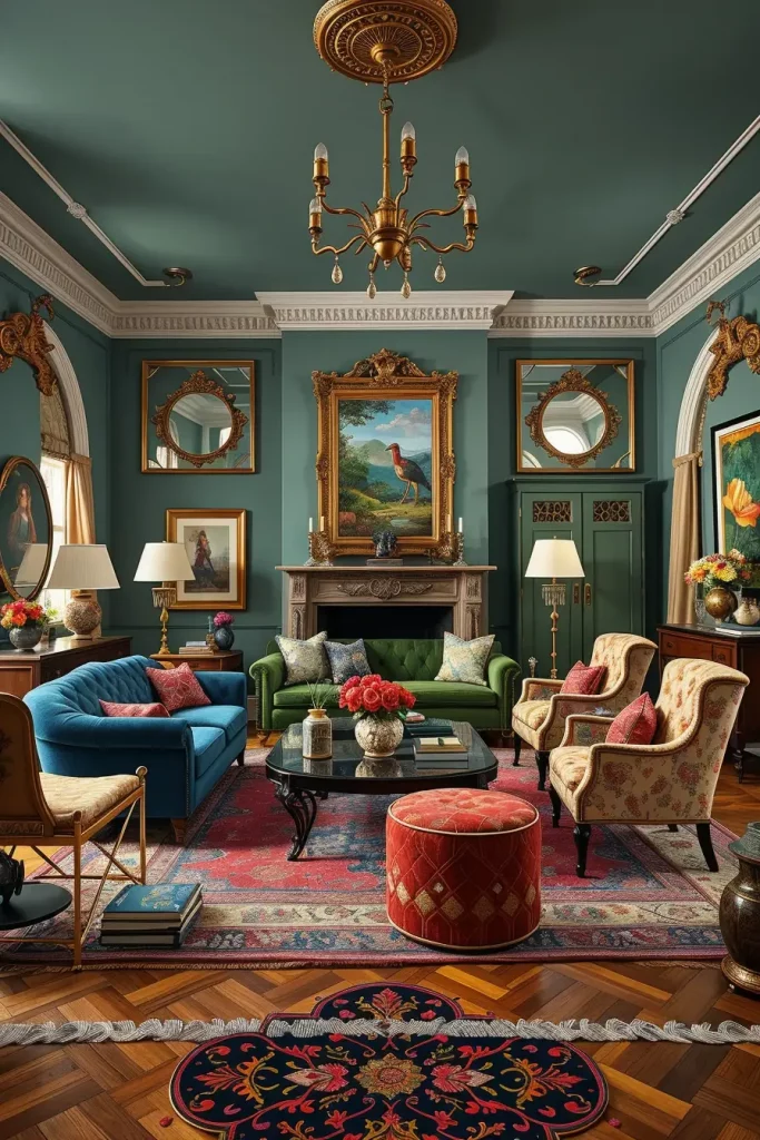 I also consider color harmony- using a palette of three or four strong colors in the room. As an example, emerald, sapphire, and ruby are jewel-toned colors that can be combined with neutral accents such as cream or black to produce a bold yet cohesive image. Furniture must be selected wisely: huge sofas with patterned fabric are a good idea, however, I would not use mismatched furniture that does not reflect the theme.