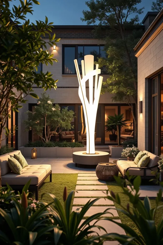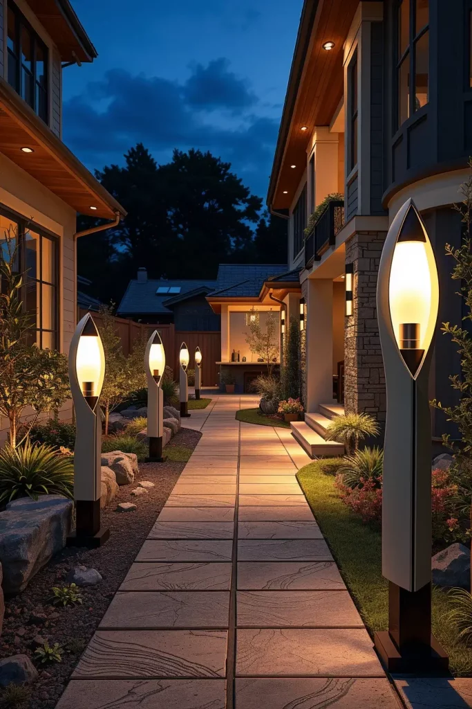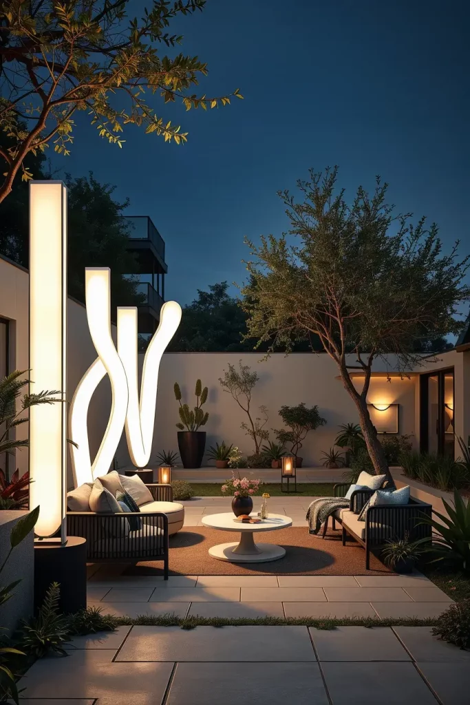 I prefer sculptural lights crafted from metal, resin, or stone-like composites, often paired with minimalist outdoor furniture and natural landscaping. Benches, lounge chairs, and dining sets are positioned to visually relate to these forms, creating a balanced outdoor scene. The lighting itself becomes a vertical or organic element that complements trees, shrubs, and architectural features.