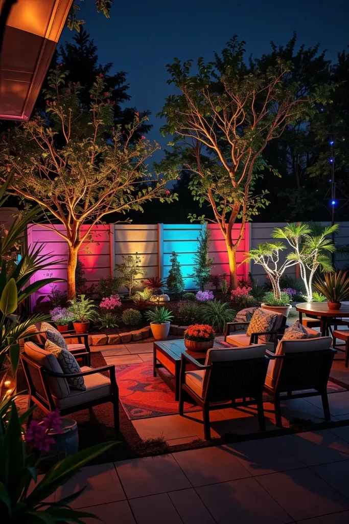Color-changing fixtures work well when paired with neutral outdoor furniture, stone patios, and simple planting schemes. I often reserve color for accent walls, trees, or water features, while keeping seating and dining areas softly lit in warm tones. This balance maintains visual comfort.