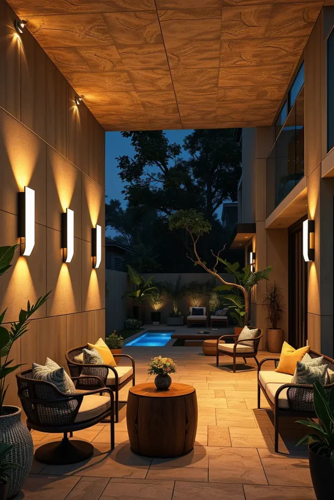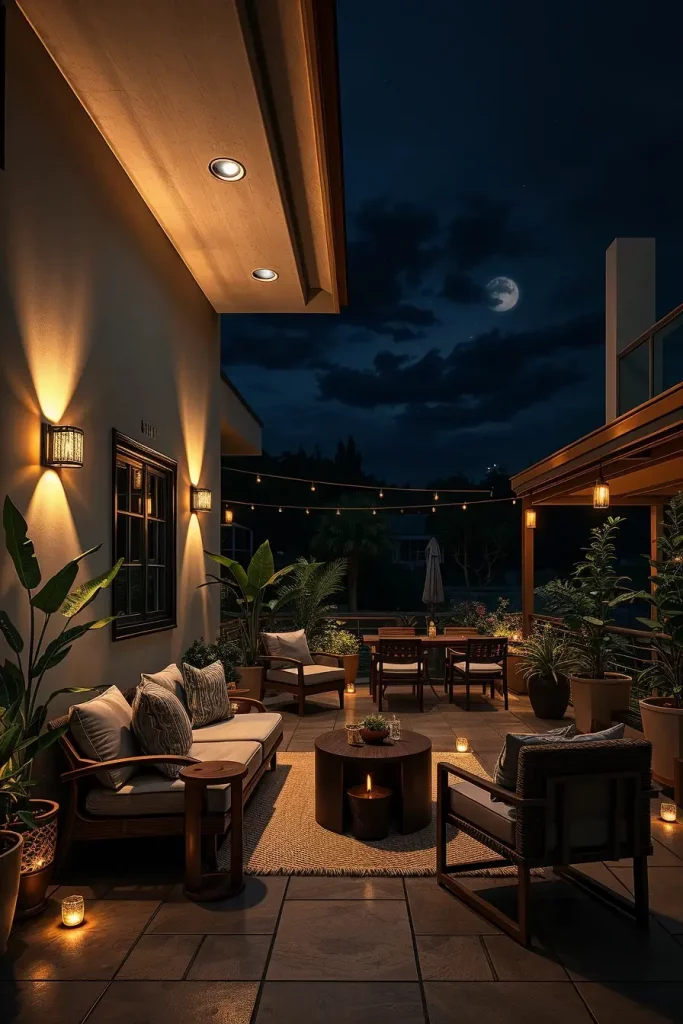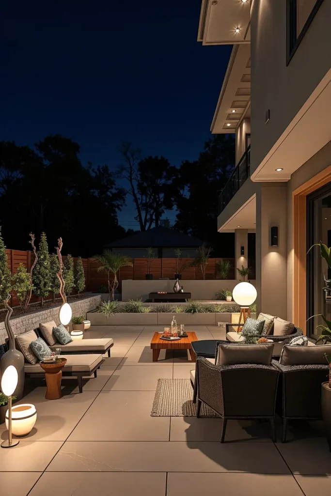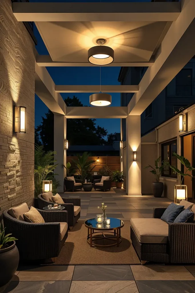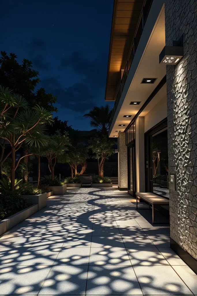 In practice, this means integrating overhead fixtures, wall-mounted lights, and ground-level illumination around furniture, steps, and architectural features. Each layer serves a distinct purpose, from general visibility to highlighting textures and materials.