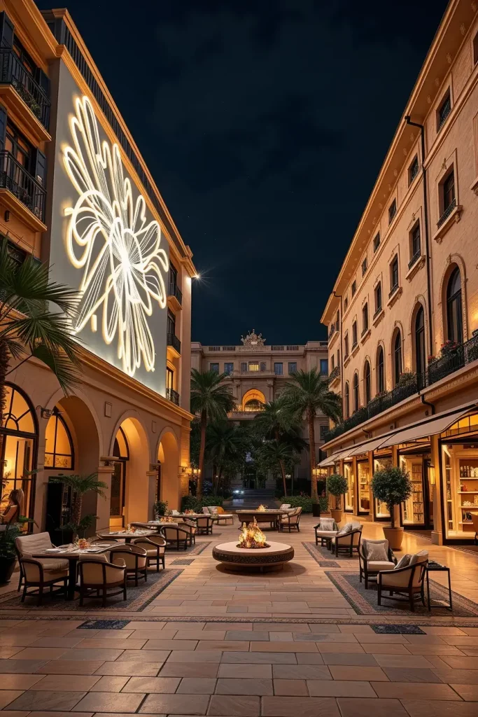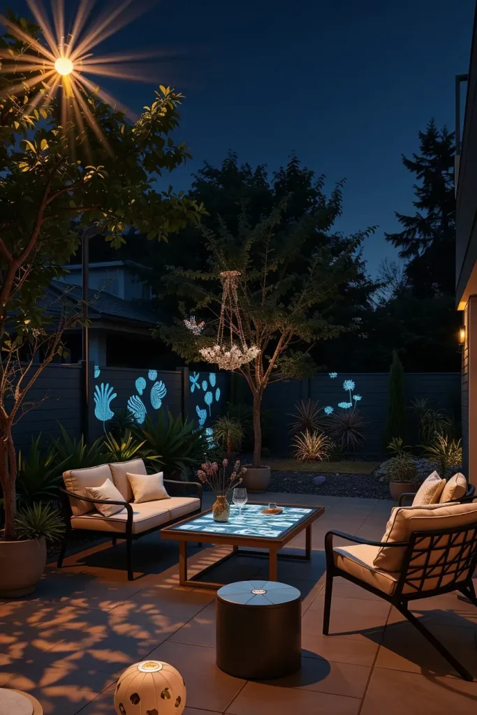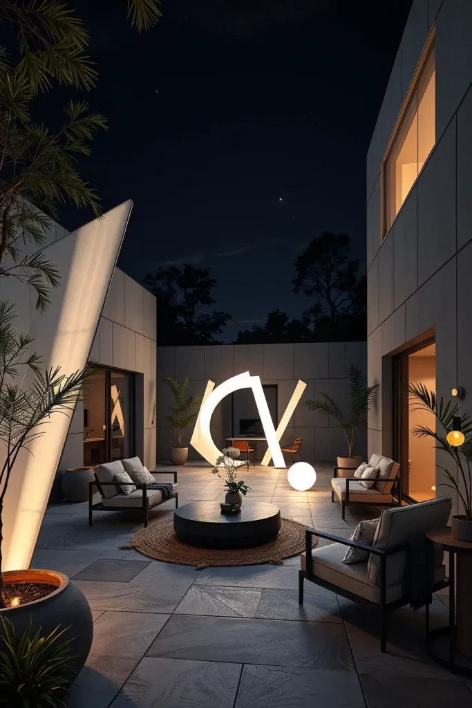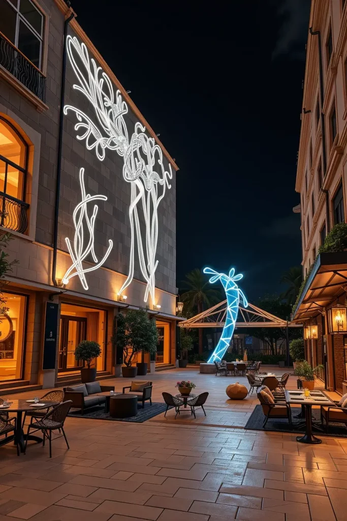 These designs may include projected patterns, layered light effects, or installations that interact with surfaces and textures. I complement them with simple outdoor furniture and restrained landscaping to prevent visual competition. The surrounding space acts as a canvas for the light.