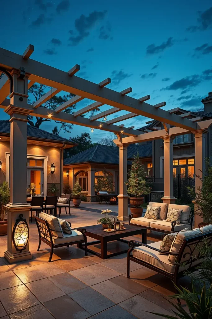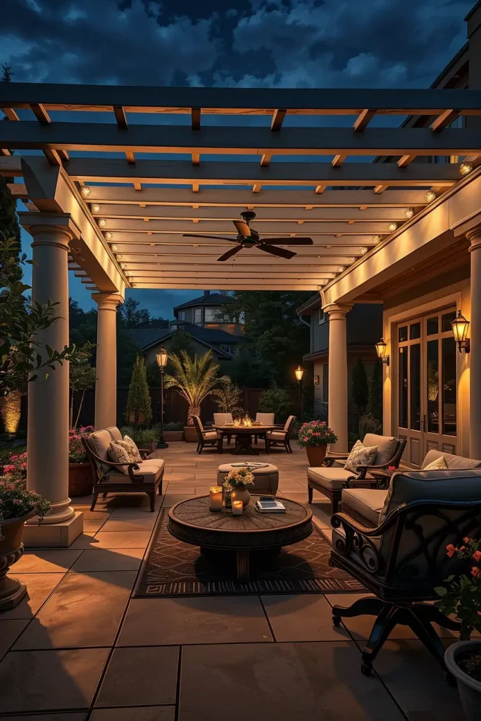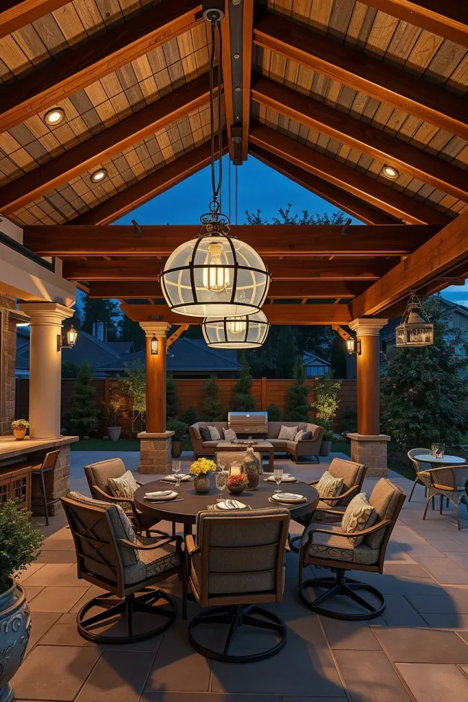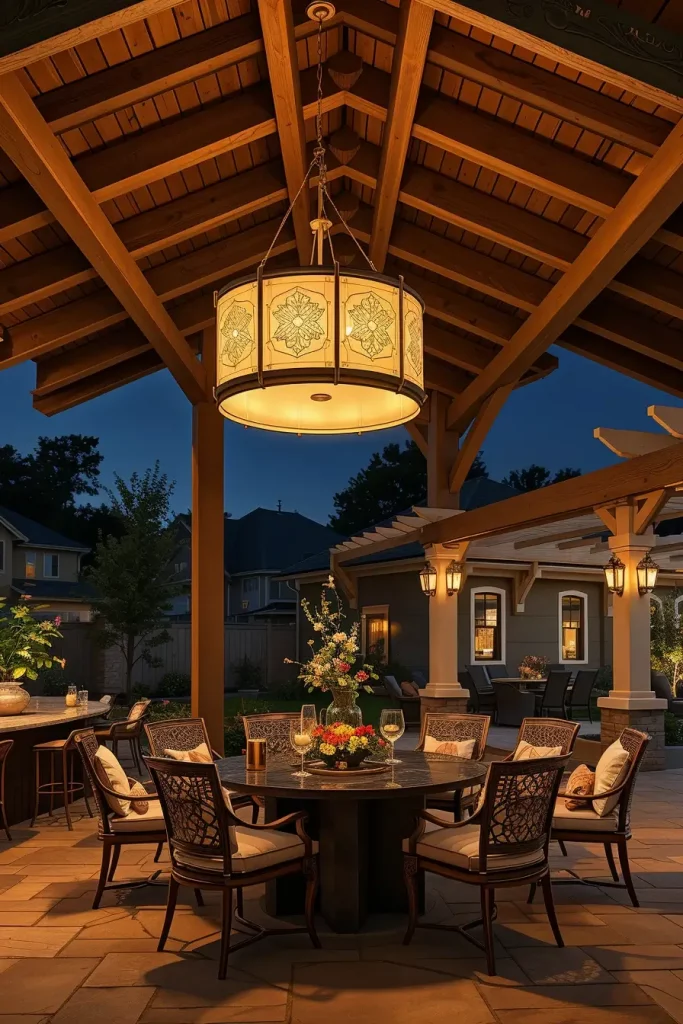 Statement pendant lighting transforms covered patios and pergolas into fully realized outdoor rooms. I view these fixtures as anchors that visually ground seating or dining areas while providing practical illumination.