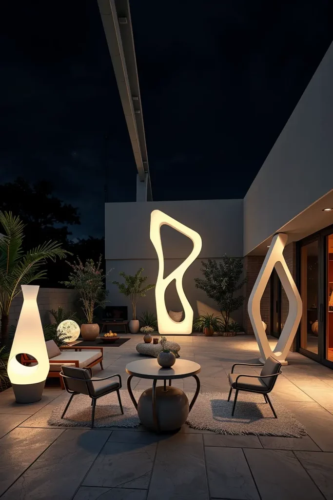 I often incorporate abstract geometries, irregular shapes, or modular lighting systems that can be reconfigured. These pieces pair well with restrained outdoor furniture and architectural surfaces, ensuring the lighting remains the primary visual statement. Materials such as translucent polymers or matte metals help soften bold forms.