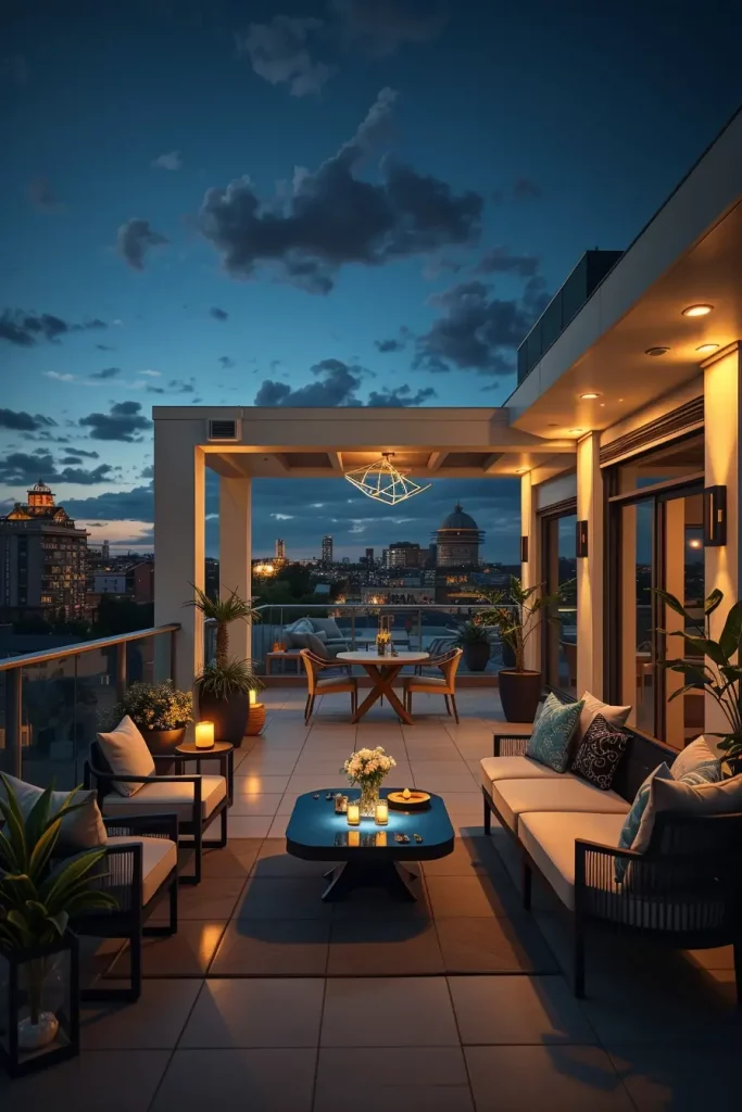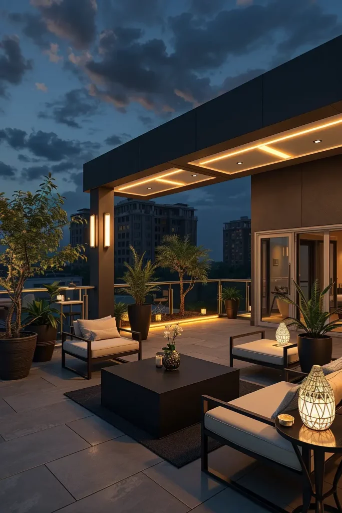 I integrate low-profile fixtures, concealed strip lighting, and sculptural accents that complement contemporary outdoor furniture. Materials such as stone, glass, and metal reflect light subtly, enhancing the terrace’s architectural character.